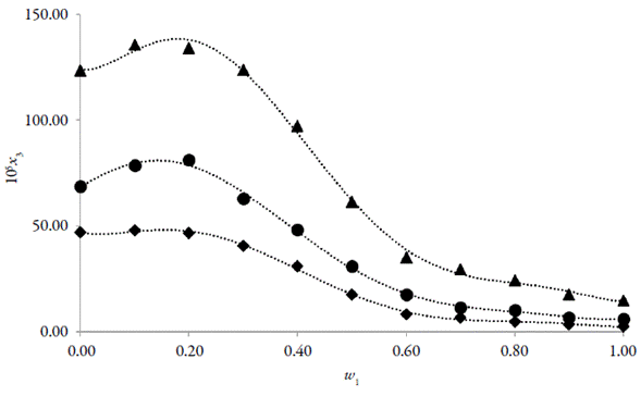 Figure 3 Solubility of SMR (3) expressed in mole fraction (x 105) in {octanol (1) + methanol (2)} cosolvent mixtures at different temperatures (♦ = 278.15 K, • = 293.15 K and ▲= 313.15 K).