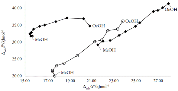 Figure 8 shows that sulfonamides (SD, SMR and SMT) in {OcOH (1) + MeOH(2)} cosolvent mixtures at 294.12 K presents a non-linear Δsoln H vs. Δsoln G° curve. SD, it presents a positive slope throughout the curve, indicating an enthalpic conduction; SMR, presents an enthalpy-driven (positive slope) [40] in mixtures OcOH-rich and intermediate and an entropy-driven (negative slope) [40] in mixtures MeOH-rich; finally the SMT, presents an entropy-driven (negative slope) in mixtures OcOH-rich and in mixtures MeOH-rich, and an enthalpy-driven in intermediate mixtures (positive slope).