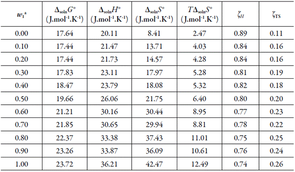 Thermodynamic functions (tables 3-5) are calculated from experimental solubility data (table 1), using the van't Hoff and Gibbs equations, following the approach proposed by Krug et al. [20-22]:
