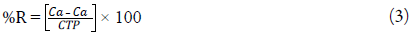 where: R is recovery, Ca is the drug concentration found in the standard added sample (μg-mL-1), Cna is the drug concentration found in the standard non-added sample (μg-mL-1) and Ctp is the theoretical standard concentration added to the sample (μg-mL-1).