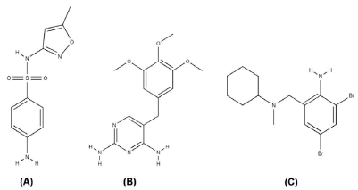 TMP, chemically known as 2,4-diamino-5-(3',4',5'-trimethoxybenzyl)-pyrimidine, has a molecular formula C14H18N4O3 and a molar mass of 290.32 g-mol-1, is a drug of the class pyrimidines that have antimalarial and antibacterial activity (figure 1B) [1, 3]. The association of SMT and TMP was introduced to the market in the late 1960s, for presenting synergistic effect and greater potency, in relation to the individual use of these agents by blocking enzymes that catalyze sequential steps in the pathway of folic acid metabolism in bacteria, which can be administered to humans and animals [3-5]. In veterinary medicine, the drugs SMT and TMP can also be found in association with the drug bromhexine (BMX). BMX, chemically called 2,4-dibromo-6-[[cyclohexyl (methyl) amino] methyl] aniline, has molecular formula C14H20Br2N2 and molar mass of 376.1 g-mol-1. BMX is a mucolytic drug used in the treatment of respiratory tract disorders (figure 1C) [1, 5].
