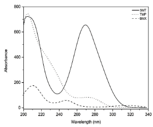 After choosing the column, mobile phase and flow for the analysis of the drugs and development of the analytical method, the wavelengths for the quantification of the drugs were selected. Spectral scans were performed with the aid of the diode array detector (DAD) in the range 200-400 nm. The wavelengths selected for SMT, TMP and BMX quantification were 265 nm, 271 nm and 245 nm, respectively, corresponding to the regions of maximum UV absorption of each drug (figure 2).