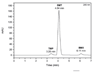 Figure 3 shows the chromatogram of the chromatographic separation of the solution of the drugs SMT, TMP and BMX, under the developed chromatographic conditions. In figure 3 is possible to verify the good chromatographic separation of the three drugs, in a short time of analysis (7 min), indicating that the method is suitable for validation and simultaneous determination of drugs in pharmaceutical formulations for animal use.