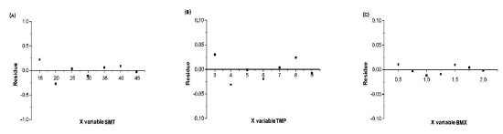 In addition to the analytical curves and the Anova test, linearity can also be verified through the regression analysis of residues. In this analysis, it was possible to verify the linearity of the method from the linear regression of the drugs under study, which were distributed in the graphs homogeneously, close to the zero axis, indicating the homoscedasticity of the variances (figure 4).