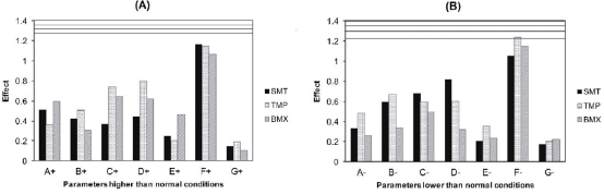 Figure 5 Critical effects and values of the levels of sulfamethoxazole (SMT), trimethoprim (TMP) and bromhexine (BMX) by the Plackett-Burman test. (A) Conditions higher than normal (1): the lines represent the critical values 1.26, 1.36 and 1.32, for the SMT, TMP and BMX drugs, respectively. (B) Conditions lower normal (-1): the lines represent the critical values 1.33, 1.37 and 1.22, for the SMT, TMP and BMX drugs, respectively.