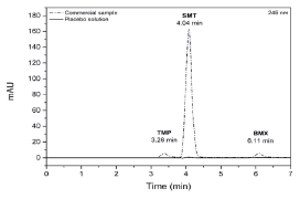 Figure 6 Chromatogram of the adjuvant placebo solution superimposed on the chromatogram of the commercial sample solution prepared in methanol:water (84:16 v/v), analyzed using the proposed chromatographic method: mobile phase methanol:water (84:16 v/v) with pH 3.0 and flow rate of 0.7 mL min-1 at 245 nm. SMT: sulfamethoxazole; TMP: trimethoprim; BMX: bromhexine.