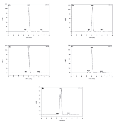 Figure 7 Chromatrograms of the association of sulfamethoxazole (SMT), trimethoprim (TMP) and bromhexine (BMX) (A) acid hydrolysis (HCl 0.1 M, 8 h); (B) alkaline hydrolysis (0.01 M NaOH, 4 h); (C) neutral hydrolysis (H2O, 30 min); (D) oxidative hydrolysis (0.03% H2O2, 30 min) and (E) photolysis (UV/VIS light, 16 h). Chromatographic conditions: AcclaimTM120 C18 column (4.6 x 250 mm, 5 μm) ThermoScientific®, mobile phase methanol:water (84:16 v/v), pH 3.0, flow rate of0.7 mL-min-1.