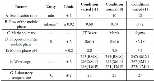 Of the modified conditions, none significantly influenced the contents of the drugs, not exceeding the critical values, as well as in the retention times, asymmetry, resolution and number of plate. Although the factors analyzed did not significantly influence the quantifications, the variations made in the conditions inferior and superior to the normal ones in the wavelength factor, were those that presented greater effects in relation to the other factors. Therefore, the method proved to be robust for simultaneous determination of SMT, TMP and BMX, being able to resist small variations in the selected parameters, since the effects on the parameters were less than the critical values.