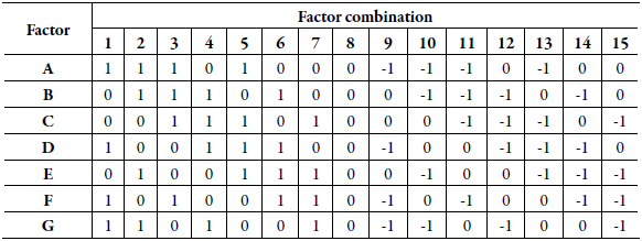 A-G: selected factors; 1-15: number of experiments.