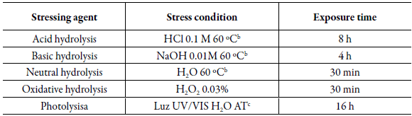 The resulting solutions were inj ected in triplicate and analyzed using the proposed chromato -graphic method: C18 AcclaimTM120 column (4.6 x 250 mm, 5 μm) from ThermoScien-tific®, mobile phase methanol and water (84:16 v/v, pH 3.0 ), adjusted with phosphoric acid, isocratic mode, flow rate of 0.7 mL-min-1. In order to carry out the forced degradation study, experimental conditions that promoted an average degradation of10 to 30% for each of the drugs were defined as ideal [31]. Table 3 shows the degradation conditions that were tested.