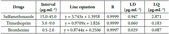 It was evaluated by building three analytical curves for each drug. The analytical curve for SMT was obtained in the concentration range of 15.0 to 45.0 μg-mL-1, for TMP in the range of 3.0 to 9.0 μg-mL-1 and for BMX in the range of 0.5 at 2.0 μg-mL-1. The determinations were carried out in triplicate and the results were submitted to linear regression analysis to obtain the analytical curves, line equations and correlation coefficients for each drug.