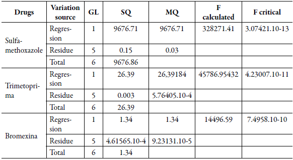 Table 6 describes the results of the statistical analysis performed by the Anova test, in which it was possible to observe that the linear regression was significant for the drugs analyzed (Fcalculated> Critical), therefore, the concentration of the analytes is correlated with the signal generated by the equipment (peak area).