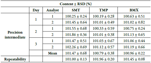 The results obtained in the intermediate precision and repeatability of the drugs under study are shown in table 7. In the determinations made with SMT, TMP and BMX, it was possible to verify that the analyzed drugs had DPR below the maximum recommended limit of 2.0%, confirming the precision of the analytical method developed [24, 33].
