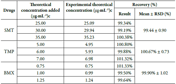 Therefore, the recovery values obtained from the drugs were within the acceptance limits of 98 to 102% for the analyzed concentration levels [25], indicating that the proposed method has accuracy for the simultaneous determination of SMT, TMP and BMX.