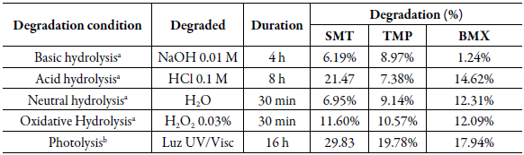 In the forced degradation study, the drug degradation percentages were determined, under the conditions selected for the degradation study of the association SMT, TMP and BMX. In table 9, it is possible to observe that the drugs had different percentages of degradation, and not all conditions allowed the degradation within the recommended limit (10 to 30%) [31].