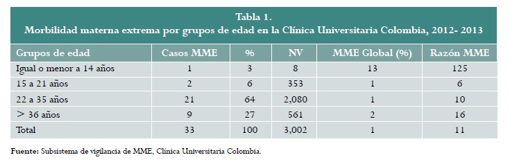 Materiales y métodos: estudio descriptivo de vigilancia epidemiológica, basado en el análisis de los resultados de la implementación del subsistema de vigilancia de la morbilidad materna extrema (MME) en la Clínica Universitaria Colombia, entre junio de 2012 y junio de 2013. Esta es una institución de referencia que atiende pacientes de una empresa de aseguramiento privado y contributivo en Bogotá. Se estableció el número de gestantes que presentó morbilidad materna extrema en dicho periodo. Se evaluó la edad materna, la situación de salud generadora del reporte, los criterios definitorios de MME y los indicadores de calidad de la MME. Se realiza análisis descriptivo de los datos y se presenta la razón de prevalencia de la morbilidad materna extrema.