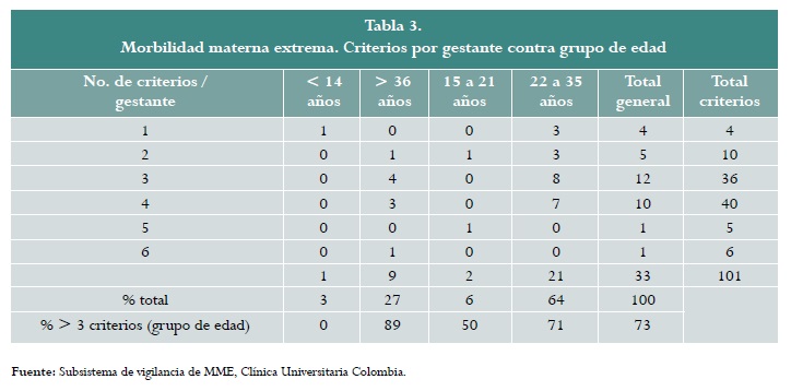 Materials and methods: Descriptive epidemiological surveillance study based on the analysis of the results of the implementation of the EMM surveillance subsystem between June 2012 and June 2013 at Clínica Universitaria Colombia, a referral centre serving patients covered by a private health insurance company in Bogotá (Colombia). The number of pregnant women presenting with extreme maternal morbidity during that time period was determined. Maternal age, the health condition leading to the report, the EMM criteria and the EMM quality indicators were evaluated. A descriptive analysis of the data was performed. The prevalence ratio of extreme maternal morbidity is presented.
