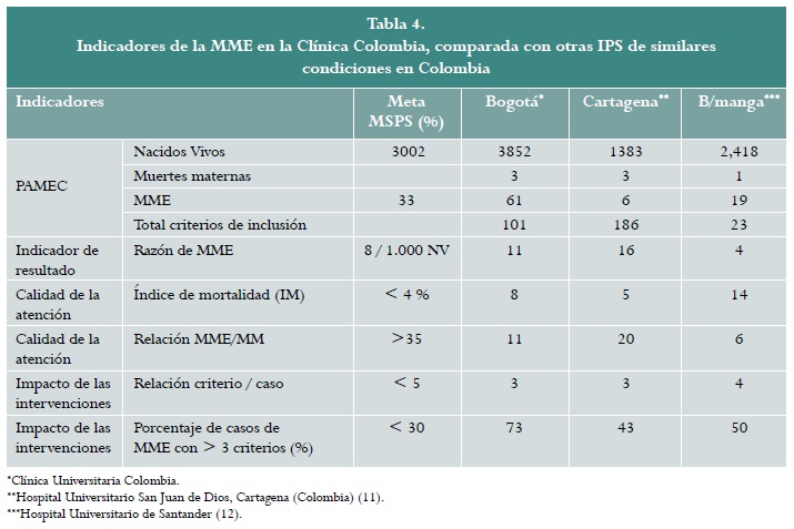 Indicadores de calidad de la MME. En el periodo del estudio la institución presentó una razón de MME de 11 por cada 1.000 nacidos vivos. El índice de mortalidad fue del 8 %. La relación MME/MM, el cual es un indicador de impacto de las intervenciones, fue de 11:1. El porcentaje de casos de MME con más de tres criterios fue del 73%.