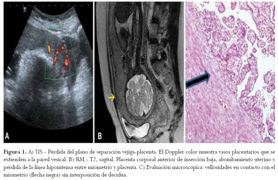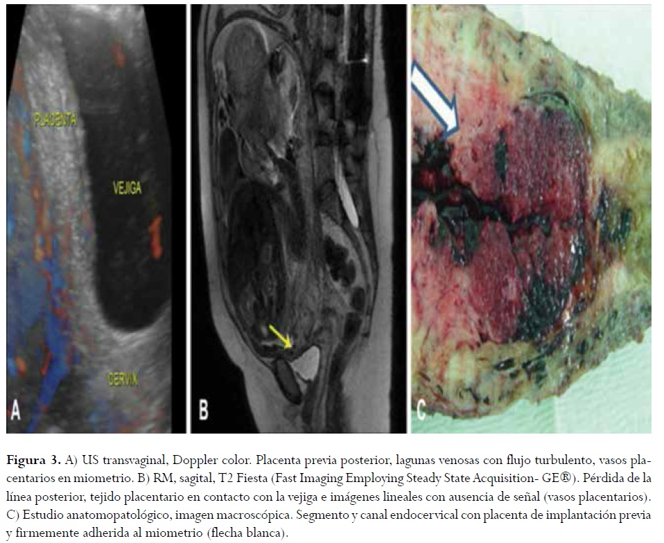 Materials and methods: We present 3 cases of women with risk factors for placenta accreta assessed prenatally at a high-complexity hospital, using ultrasound (US) and magnetic resonance imaging (MRI), with histopathological confirmation of the diagnosis. Clinical and imaging findings are described, together with their histological correlation. A search of the literature was conducted through PubMed, LILACS, and Ebsco, including original papers, topic reviews and case reports on the use and more important aspects of US and MRI in the prenatal diagnosis of placenta accreta.