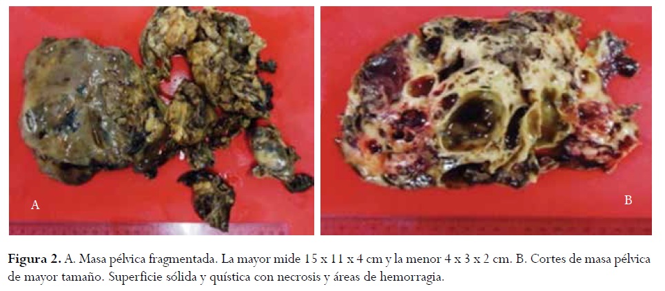 Paciente de 73 años, que consultó a la Clínica Maternidad Rafael Calvo de Cartagena (Colombia), institución de segundo nivel de complejidad, la cual es centro de referencia para la atención ginecoobstétrica en el departamento de Bolívar, que atiende a pacientes del aseguramiento subsidiado por el Estado en el régimen de seguridad social en Colombia. Fue vista con cuadro clínico de seis meses de evolución caracterizado por sangrado vaginal, astenia, adinamia y pérdida de peso no cuantificada. Antecedentes personales: hipertensión arterial en tratamiento. Al examen físico presentaba palidez mucocutánea generalizada y masa en hipogastrio. La ecografía abdominal total reportó útero aumentado de tamaño con masa 10 x 8 cm, y otra en el fondo del saco de Douglas, de límites mal definidos, de 13 x 10 cm. Se diagnosticó tumor maligno de ovario, motivando valoración por ginecología oncológica. Se lleva a cirugía, donde se encuentra masa que ocupa fondo de saco de Douglas que compromete el recto y la pared pélvica, con múltiples vesículas y tabiques; útero aumentado de tamaño, reblandecido, con infiltración de tumor en cérvix; los ovarios, de aspecto atrófico, están libres de tumor (figuras 1 y 2). Se realiza histerectomía abdominal total, salpingo-oforectomía bilateral, omentectomía parcial, apendicetomía y liberación de adherencias en pelvis y útero. Durante el acto quirúrgico requirió soporte inotrópico, transfusión sanguínea, colocación de catéter central y monitorización posquirúrgica en cuidados intermedios con diagnóstico de shock hipovolémico más sarcoma uterino con extensión a pelvis. Se realiza estudio histológico que reporta útero con carcinosarcoma endometrial/tumor mülleriano mixto maligno, en estadio IV-B según la estadificación FIGO, infiltrante (tamaño tumoral: 13 x 12 x 5 cm), con invasión linfovascular, sin evidencia de componente mesenquimal heterólogo (figura 3). Resección de lesión pélvica, evidencia de metástasis por carcinosarcoma, fragmentado (masa mayor tamaño 15 x 11 x 4 cm y masa menor tamaño 4 x 3 x 2 cm). La paciente inicia seguimiento por ginecología oncológica, y en conjunto con familiares deciden no realizar tratamiento adyuvante, se mantiene estable y sin recaída hasta los tres meses de seguimiento; seis meses después fallece.