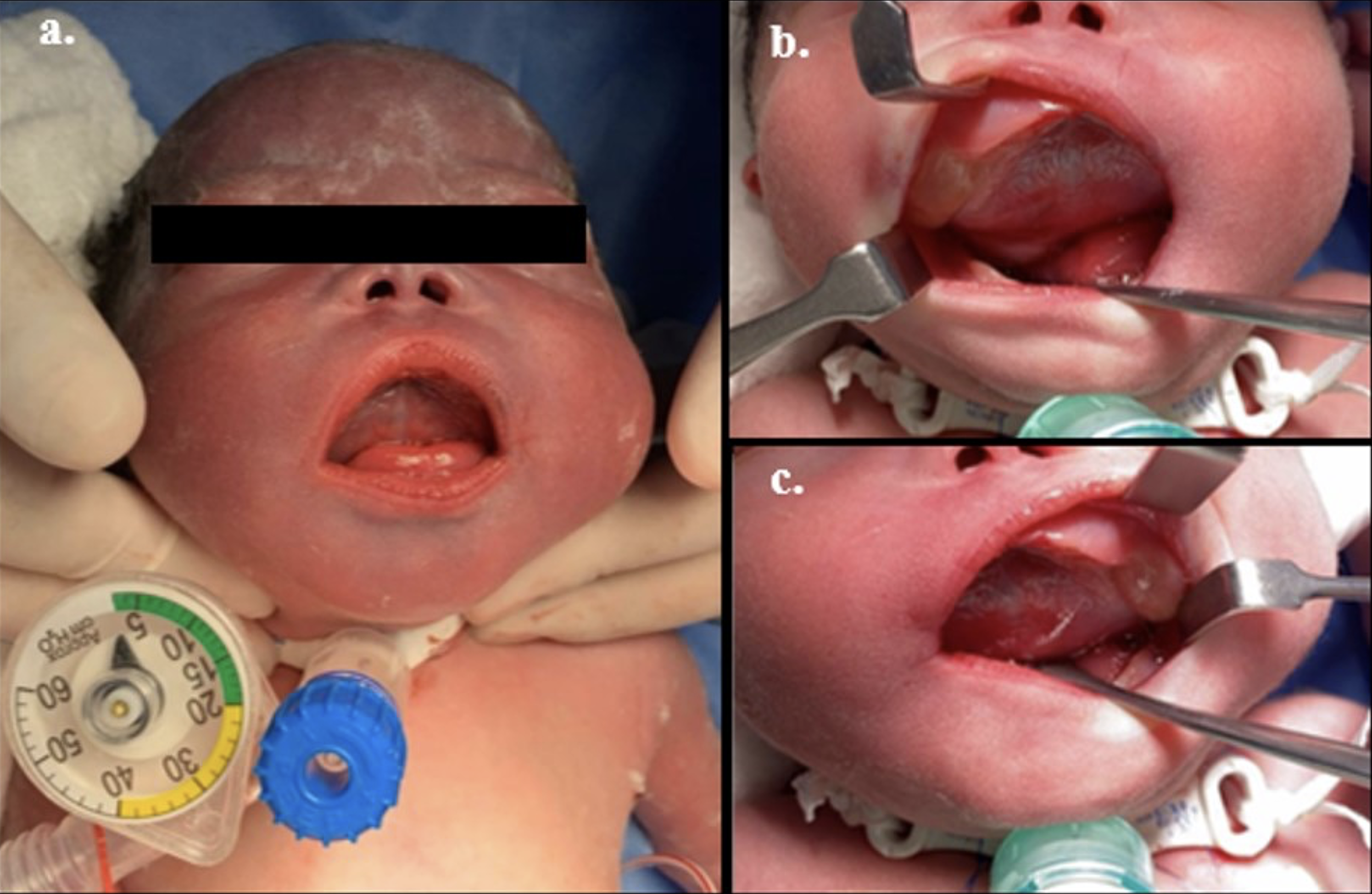 Al examen físico neonatal se evidenció malformación de línea media, maxilar superior con hipertelorismo, hipoplasia de los huesos propios de la nariz con fosas nasales hipoplásicas; en boca se identificó masa de consistencia blanda, no móvil, que obstruía la vía aérea superior dependiente de paladar blando y paladar duro (Figura 2); se realizó nasofibrolaringoscopia con paso de lente flexible por ambas fosas nasales logrando identificar únicamente la cabeza de cornetes inferiores, a partir del área II bilateral se observó masa de consistencia cauchosa con obstrucción del 100 % de la luz en ambas fosas nasales; la epiglotis, supraglotis y glotis con anatomía normal. En la valoración multidisciplinaria en salas de cirugía de pediatría, neonatología, otorrinolaringología y cirugía pediátrica se realizó traqueostomía y se hospitalizó la recién nacida para estudios complementarios. Con una adecuada evolución posoperatoria, la paciente tuvo egreso hospitalario a las 48 horas.