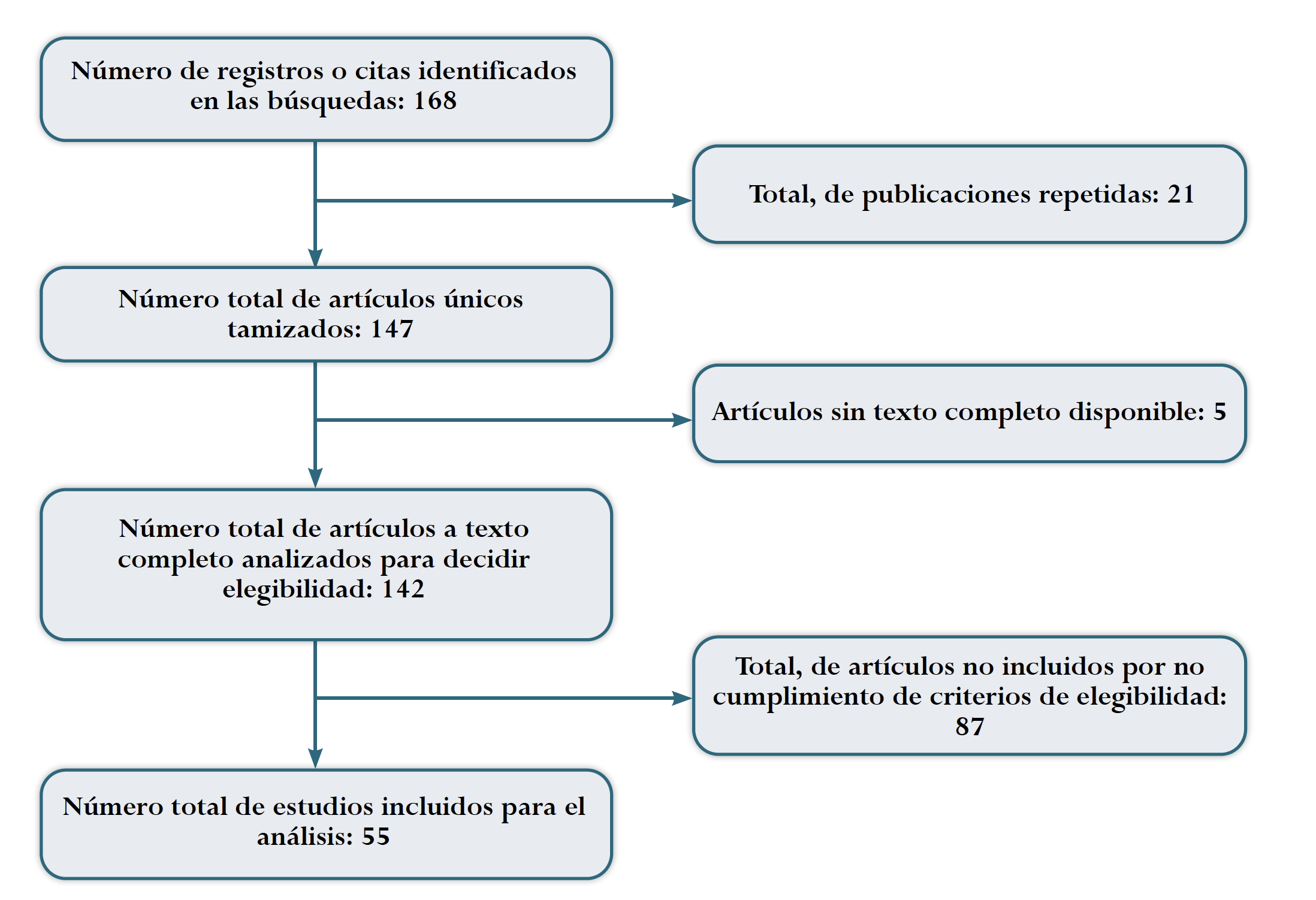 Se identificaron 168 títulos de los cuales se seleccionaron 55 estudios que cumplieron con los criterios de inclusión (ver Figura 4 y Tabla 1). Del total de estudios seleccionados, 53 correspondían a reportes de caso 6,8-12,17-49,52-65 y dos a series de casos 50,51.
