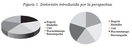- No utilice perspectiva en los gráficos: esta agrega una tercera dimensión que no existe en los datos y puede dificultar la interpretación. La figura 1 muestra cómo la perspectiva distorsiona los datos y hace aparecer un componente como significativamente mayor que otro. Los dos gráficos muestran los mismos datos; uno, con perspectiva y donde parece que la frecuencia en Cali es claramente mayor que en las otras ciudades. La gráfica sin perspectiva muestra que las frecuencias son iguales para las cinco ciudades.