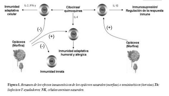 Existe la suficiente evidencia experimental para sugerir que la morfina endógena o aquella administrada de manera exógena tiene un papel ampliamente inhibitorio sobre los mecanismos de activación de la respuesta inmune, ejerciendo una influencia significativa sobre la actividad de las células NK, la proliferación linfocitaria y la capacidad fagocítica de polimorfonucleares y monocitos. Así mismo, esta sustancia tiene la capacidad de modificar el balance Th1/Th2, inhibiendo la respuesta inmune mediada por células, crítica para hacer frente a virus y otro tipo de parásitos intracelulares (figura 1) .