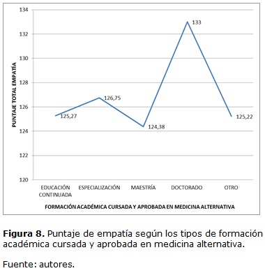 Los datos de variables pareadas, puntaje total de empatía y formación académica en medicina alternativa, tampoco indican diferencia estadísticamente significativa (p=0,85). Para los niveles de formación académica en medicina alternativa cursados y aprobados, los puntajes de empatía no demuestran diferencia estadísticamente significativa que indique mayor grado de influencia en la empatía -p=0,56 p=0,208 p=0,591 y p=0,9 para cursos de educación continuada, especialización, maestría y "otro", respectivamente-.