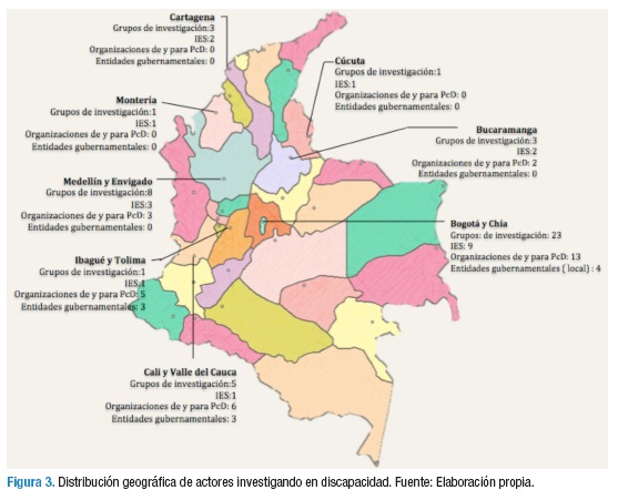 Results. 88 actors were identified. 45 of them are research groups, 28 are organizations of or for people with disabilities, and 15 are government agencies. A concentration of research capacities in the main cities, mainly in Bogotá, is noted.