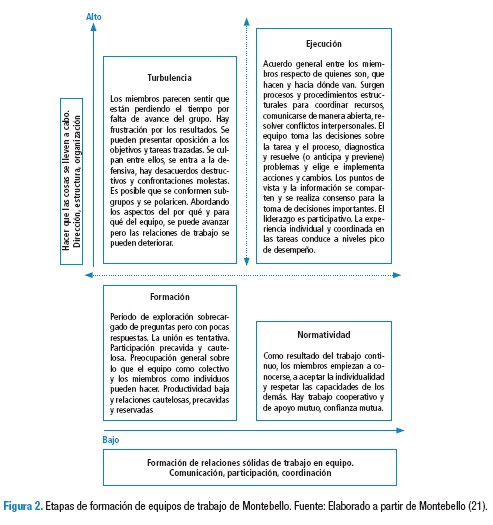En síntesis, el trabajo en red es un trabajo en equipo donde confluyen diversas habilidades y conocimientos que se ponen en juego para lograr un objetivo común, por lo que resulta fundamental trabajar de forma colaborativa y cooperativa. Como una entidad viva, se desarrolla, crece. Montebello (21) plantea 4 etapas de formación de los equipos de trabajo: Etapa 1: Formación, Afiliación precavida al grupo. Etapa 2: Turbulencia, Relaciones competitivas y tensas. Etapa 3: Normatividad, Cohesión armoniosa entre los miembros. Etapa 4: Ejecución, Trabajo colaborador en equipo.