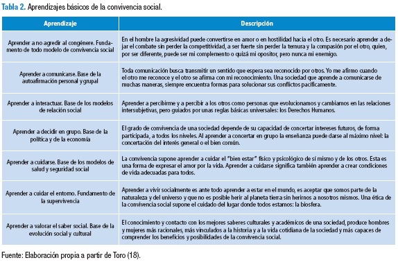 Esta idea de ciudadanía remite a la idea de convivencia, esa vida en común viable entre grupos diversos cultural, social o políticamente. En este sentido, se habla de una serie de valores democráticos y formas de actuación que permiten construir a cada paso el ideal de una sociedad cohesionada, diversa, con identidades particulares pero con objetivos comunes. Para Toro (18,19) hay siete aprendizajes básicos para la convivencia social (Tabla 2).