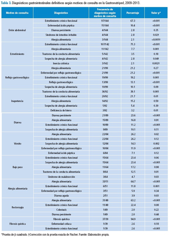 Objetivos. Relacionar motivos de consulta con diagnósticos gastrointestinales definitivos (DGID) en pacientes pediátricos que acuden a una unidad de gastroenterología.