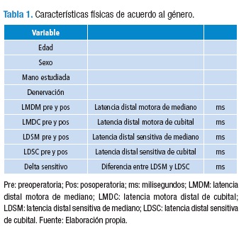 Los pacientes fueron evaluados con estudios electrodiagnósticos en dos momentos: el primero entre 0 y 8 meses antes de la cirugía y el segundo entre 2 y 8 meses después de la cirugía. Los estudios fueron realizados por diferentes operadores de un mismo laboratorio de electrofisiología y la técnica usada fue la antidrómica para los estudios sensitivos con registro en cuarto dedo, para comparación de latencias mediano-cubital, usándose electrodos de superficie.