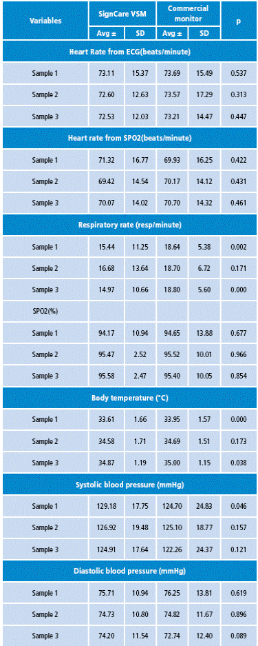 The vital signs measurements collected from 98 patients using the SignCare VSM and a commercial monitor were analyzed. A general description of the variables of interest was done; for this purpose, continuous variables were described as averages with standard deviation (SD) and the variables category as absolute (n) and relative (%) frequencies. Also, the comparison of measurements obtained with the SignCare VSM and the commercial Mindray PM-8000 VSM was performed.