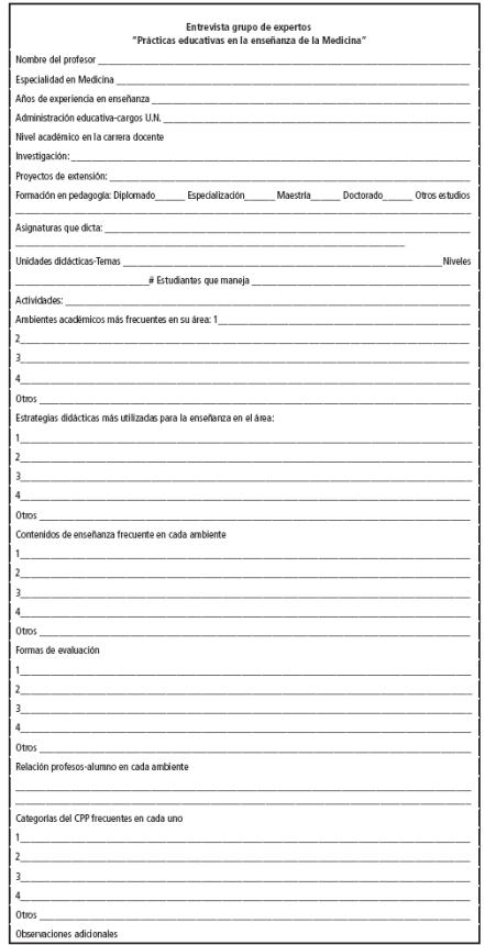 Se seleccionó un grupo de expertos conformado por 15 profesores de la carrera de Medicina en la Universidad Nacional de Colombia 15,16, quienes cumplieron con los criterios de inclusión definidos para la investigación: ser especialistas en diferentes campos de la medicina y tener una experiencia mayor a 10 años de ejercicio docente. Esto con el propósito de estudiar la realidad del significado, las fuentes y la composición que tienen las prácticas educativas y el CPPM que se ejerce en estas.