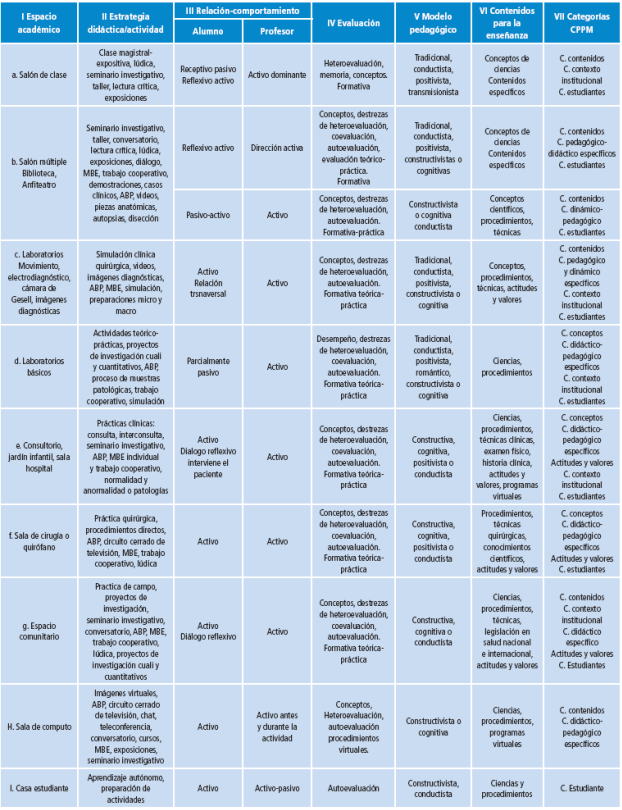 En la Tabla 2 se consignaron los siguientes conceptos: contextos académicos, maniobras didácticas útiles, modelos pedagógicos, formas y tipos de evaluación, participación de los actores del proceso de enseñanza/aprendizaje y componentes del CPPM utilizados en los diferentes espacios. Su aplicación pretendió dar claridad a los elementos que componen las prácticas útiles en el proceso de enseñanza, aprendizaje y evaluación en medicina.