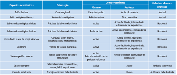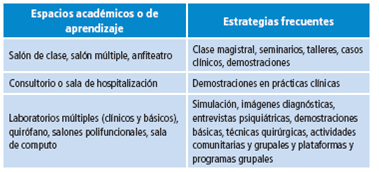 Los espacios académicos más frecuentes son los salones de clase o salones múltiples; pero en las prácticas clínicas se utilizan el consultorio y la sala de hospitalización, en las asignaturas quirúrgicas se incluye el quirófano y las salas anexas (circuito cerrado de TV) y en anatomía e histología es corriente el uso del anfiteatro. Asimismo, los laboratorios son habituales en las asignaturas básicas para el trabajo cooperativo y el aprendizaje de técnicas útiles.