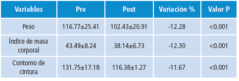 El peso y el IMC posterior a la intervención disminuyeron de forma significativa (p<0.001) en un 12.28% y 12.30%, respectivamente. El contorno de cintura (CC) presentó una disminución del 11.67% (Tabla 2).