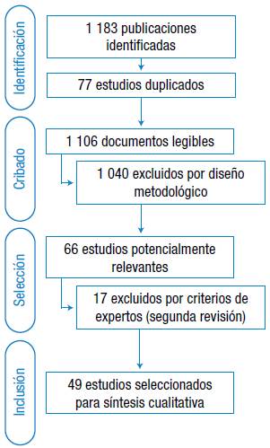 Tras la aplicación de los criterios de elegibilidad establecidos para la presente revisión sistemática, se seleccionaron 49 artículos siguiendo el flujograma de selección propuesto desde los lineamientos ya citados (Figura 1).