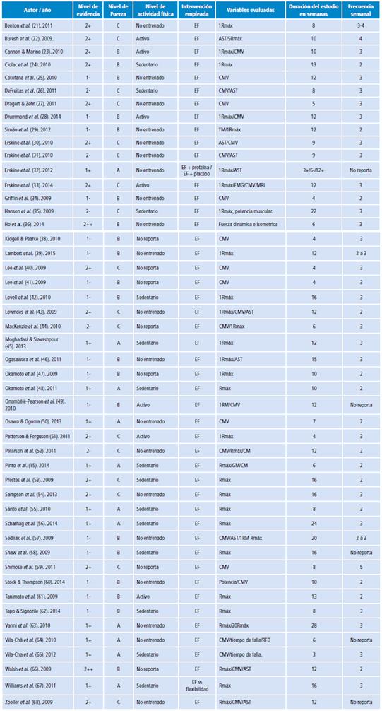 Período de publicación: se incluyeron los estudios publicados entre enero de 2009 y diciembre de 2015. Idioma: solo fueron considerados los artículos publicados en inglés. Pacientes: hombres y mujeres entre 19 y 79 años de edad; sedentarios o sin experiencia previa en entrenamiento de fuerza muscular seis meses antes del inicio de la intervención; sanos, y sin participación en estudios o hábitos de vida que pudieran generar sesgo en los resultados.