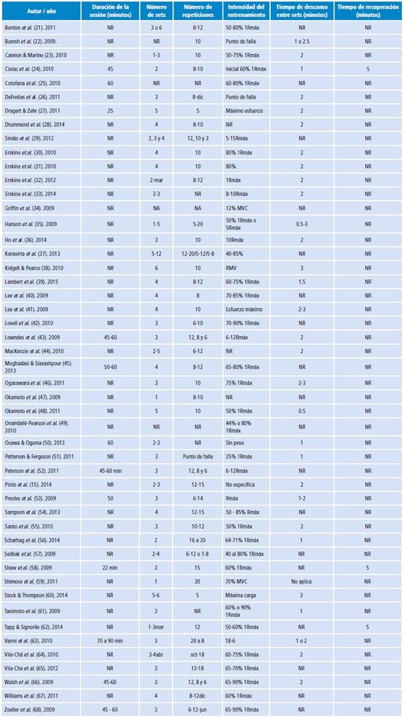 Duración de la sesión: no es posible establecer la duración promedio de una sesión de entrenamiento muscular porque en el 76% de los casos no fue reportada esta variable dentro de la descripción metodológica de los estudios.