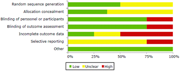 According to the GRADE system, publications bias should be assessed using a funnel plot and asymmetry statistical tests if 10 or more studies are included in a systematic review or a meta-analysis; therefore, since only 8 studies were included in this review, a funnel plot was not required to assess publication bias. The RCTs included (n=8) had limitations regarding the use of risk of bias tools, which are detailed in Figure 2 and Appendix B. In this regard, 4 trials19,22,23,25 implemented a valid sequence generation method and 3 established an adequate allocation concealment process (Figure 2), 19,22,23,25 making selection bias unclear.