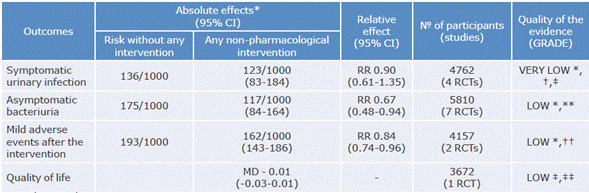 Low-quality evidence showed that, compared to the control group, the use of non-pharmacological intervention does not seem to decrease the frequency of symptomatic urinary infections20,22,23,25 (RR 0.90, 95%CI: 0.61-1.35; 4 762 participants, 4 RCTs; 12 statistic: 63%), or improve quality-of-life scores (MD -0.01 EQ-5D scale; 95%CI: -0.03-0.01,1 RCT) (Figure 3). However, there was evidence of differences between groups in terms of asymptomatic bacteriuria episodes19-21,23-26 (RR 0.67, 95%CI: 0.48-0.94; 5 810 participants, 7 studies; 12 statistic: 71%) (Figure 4) and the rate 0.96; 4 157 participants, 2 trials; 12 statistic: 0%) of mild adverse events23,25 (RR 0.84, 95%CI: 0.74- (Figure 5).