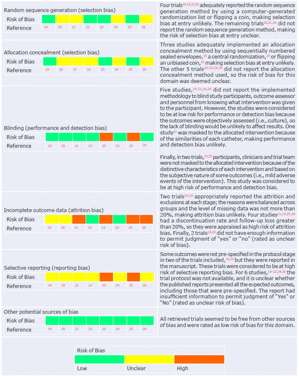 Regarding blinding, 5 studies19-21,24,26 did not report the method implemented. However, the studies were considered to be at low risk of detection and performance bias since the results were objectively appraised (i.e., culture) and, therefore, the lack of blinding is unlikely to affect confidence in the results. One study22 was masked to the allocated intervention because of the similarity of the interventions, making performance and detection bias unlikely. Finally, 23,25 the participants of 2 trials were not masked to the intervention because of the distinctive appearance of the catheters; based on the subjective nature of some outcomes (i.e., mild adverse events of the intervention), these RCTs were considered as having high risk of performance and detection bias.