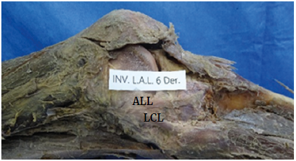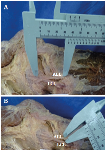 The morphometric study found that the length of the ALL ranged from 24mm to 52.4mm, with an average of 37.34mm, and that the width at the middle third of the ligament ranged from 2.6mm to 6mm, with an average of 3.91mm (Figure 2 and Table 1).
