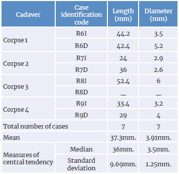 The material was obtained in accordance with the criteria defined in Decree 786 of 1990 of the Colombian Ministry of Public Health12 on clinical and medicolegal autopsies. Likewise, the study adhered to the ethical principles for medical research involving human subjects established by the Declaration of Helsinki.13