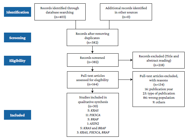 Regarding their geographical distribution, 10 studies were conducted in Asia; 8, in America; 5, in the Middle East; 3, in Europe; 2, in Oceania, and 1, in Africa. Regarding sample size, studies addressing KRAS, PIK3CA and BRAF mutations were conducted in samples ranging from 49 to 5 732, 61 to 2 299, and 17 to 1 110 individuals, respectively. Besides, all studies were cross-sectional (Table 1).
