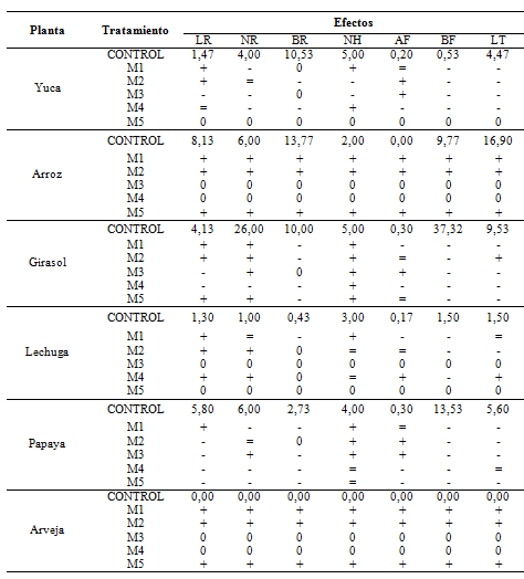 Tabla 3. Efecto de los tratamientos en las plantas: positivo (+), negativo (-), Ningún efecto (=) y No hubo crecimiento (0).