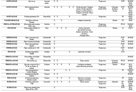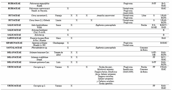 Se encontraron 25 especies vegetales que son consumidas por aves frugívoras, entre ellas se destacan Moquillo (Saurauia brachybotrys Turcz, Saurauia pruinosa R.E. Schultes), Pelotillo (Viburnum triphyllum Benth.), Charmolán (Geissanthus sp.), Cucharo (Myrsine coriacea (Sw.) R. Br. ex Roem. & Schult.y Myrsine guianensis (Aubl.) Kuntze), Zurrumbo (Trema micrantha (L.) Blume), Poroto (Erythrina edulis Triana ex Micheli), Frutillo (Senna pistaciifolia (Kunth) H.S. Irwin & Barneby), Vainillo (Senna spectabilis (DC.) H.S. Irwin & Barneby), Yarumo (Cecropia sp), ímpamo (Clusia ellipticifolia Cuatrec.), Ímpamo mambito (Clusia sp.), Arnalulo (Cavendishia bracteata (Ruíz & Pav. ex J. St.-Hil.) Hoerold), Guásimo (Cordia acuta Pittier), Guamo (Inga densiflora Benth., Inga edulis Mart.), Guayacán (Lafoensia acuminata (Ruíz & Pav.) DC.), Arrayán (Myrcia popayanensis Hieron.), Níspero (Eriobotrya japónica (Thunb.) Lindl.), Cascarillo (Cinchona pubescens Vahl), Laurel (Morella pubescens (Humb. & Bonpl. ex Willd.) Wilbur), Phoradenderon sp., que se constituyen en la principal dieta para aves como Vireo olivaceus, Tangara xanthocephala, Tangara vitriolina, Drendoica fusca, Saltator atripennis, Piranga flava, Euphonia cyanocephala, Myioborus miniatus, entre otras (Tabla 3).
